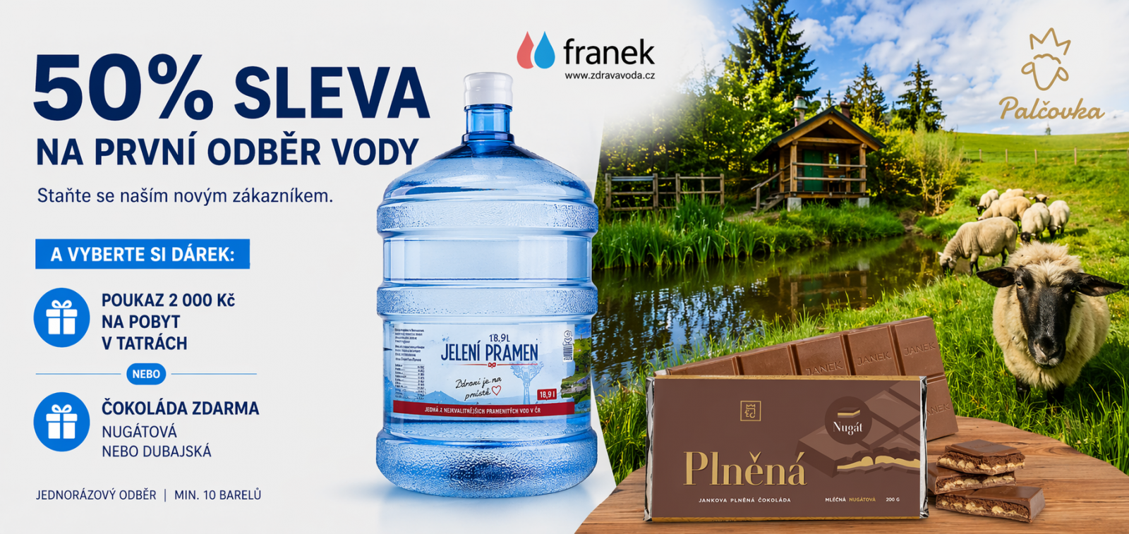 Získejte 50% slevu na první nákup barelové vody a navíc od nás obdržíte dárkový poukaz v hodnotě 2000 Kč na rodinný pobyt na chalupě Palčovka www.palcovka.cz. Využijte výhodnou nabídku a dopřejte si kvalitní vodu i zasloužený odpočinek nebo luxusní čokoládu od Janka z Uherského Brodu.